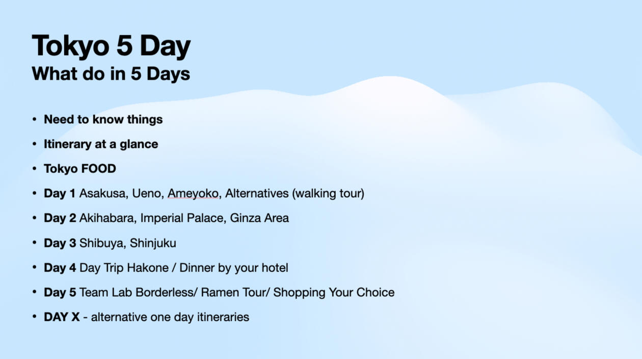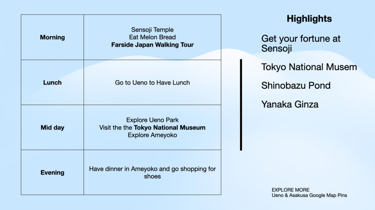 Everything you need to explore Tokyo with confidence — already mapped out for you.You’ll have everything in one simple itinerary — just open your phone and go.